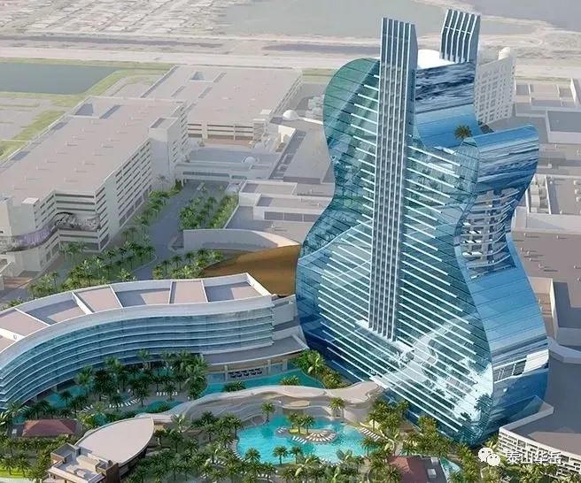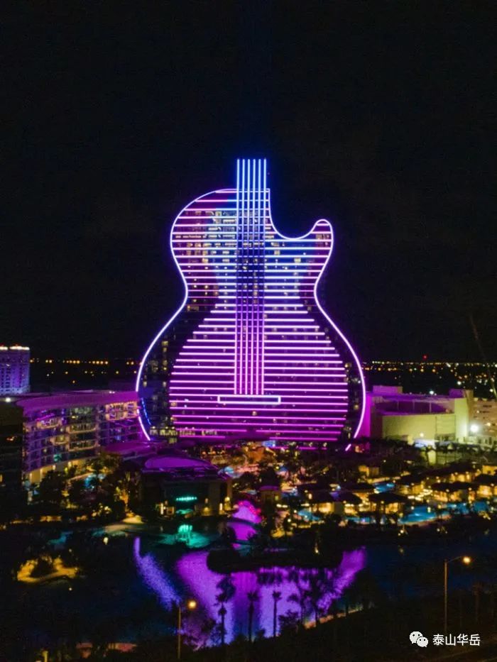 | 全球首栋吉他大厦位于佛罗里达州好莱坞的塞米诺尔硬石酒店及赌场是物业扩张的一部分,估计耗资15亿美元,共36层,这座400英尺高的吉他形酒店非常引人注目。 吉他造型,配合灯光、烟花、音乐,更强的带入感,置身其中留恋往返,吸引万千游客蜂拥而至,使酒店成为体验性的中心和南佛罗里达州的照明建筑信标。 在酒店进行盛大开幕之际,是由来自蒙特利尔的创意机构Float4与DCL视觉传达设计公司共同为开幕仪式设计了独特的霓虹灯光秀。将400英尺高的外墙变成了LED墙,并配备了230万个LED灯,视频地图和激光。将每天进行两次灯光表演,其叙述和主题向音乐对Hard Rock故事的重要性致敬。 ▼酒店全景overlook to the hotel