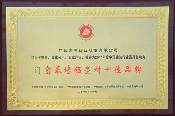 中国建筑行业最具影响力“门窗幕墙铝型材十佳品牌”评选活动历时三个月,经过行业推选、媒体公示、专家评审等公平、公正、公开环节,于11月4日至6日在北京怡生园国际会议中心揭晓获奖名单,广东豪美铝业股份有限公司凭借雄厚的企业实力、良好的企业形象及市场影响力获此殊荣,继2013年度再一次荣获此荣誉。