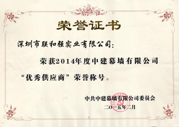 2014中建幕墙有限公司“优秀供应商”证书 |