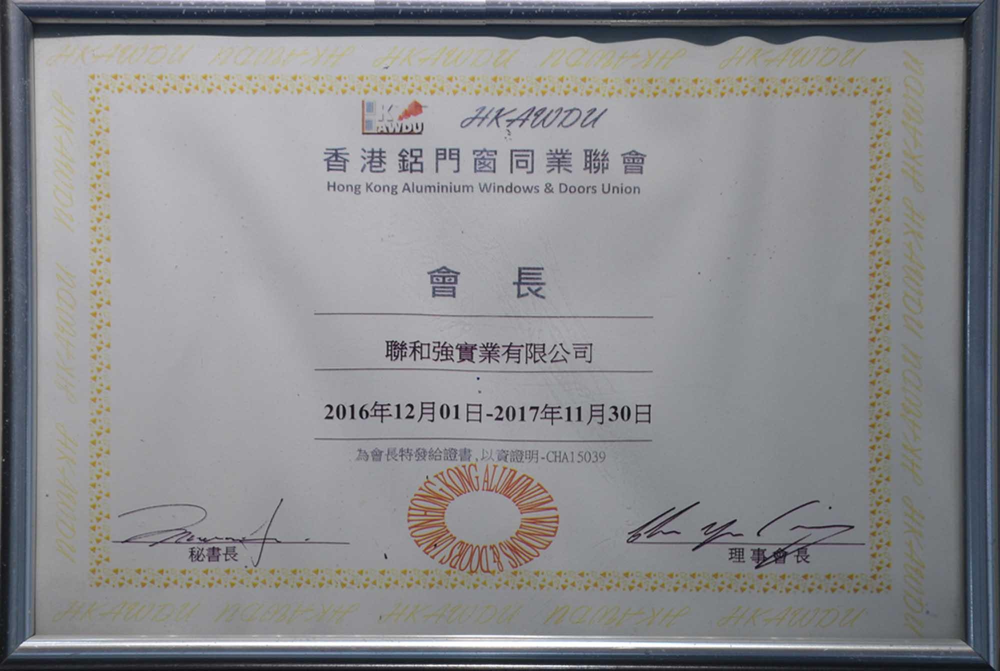 香港铝门窗同业联会会长证书 |