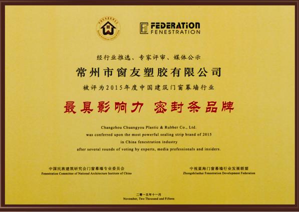 2015年度最具影响力密封条品牌奖牌 |