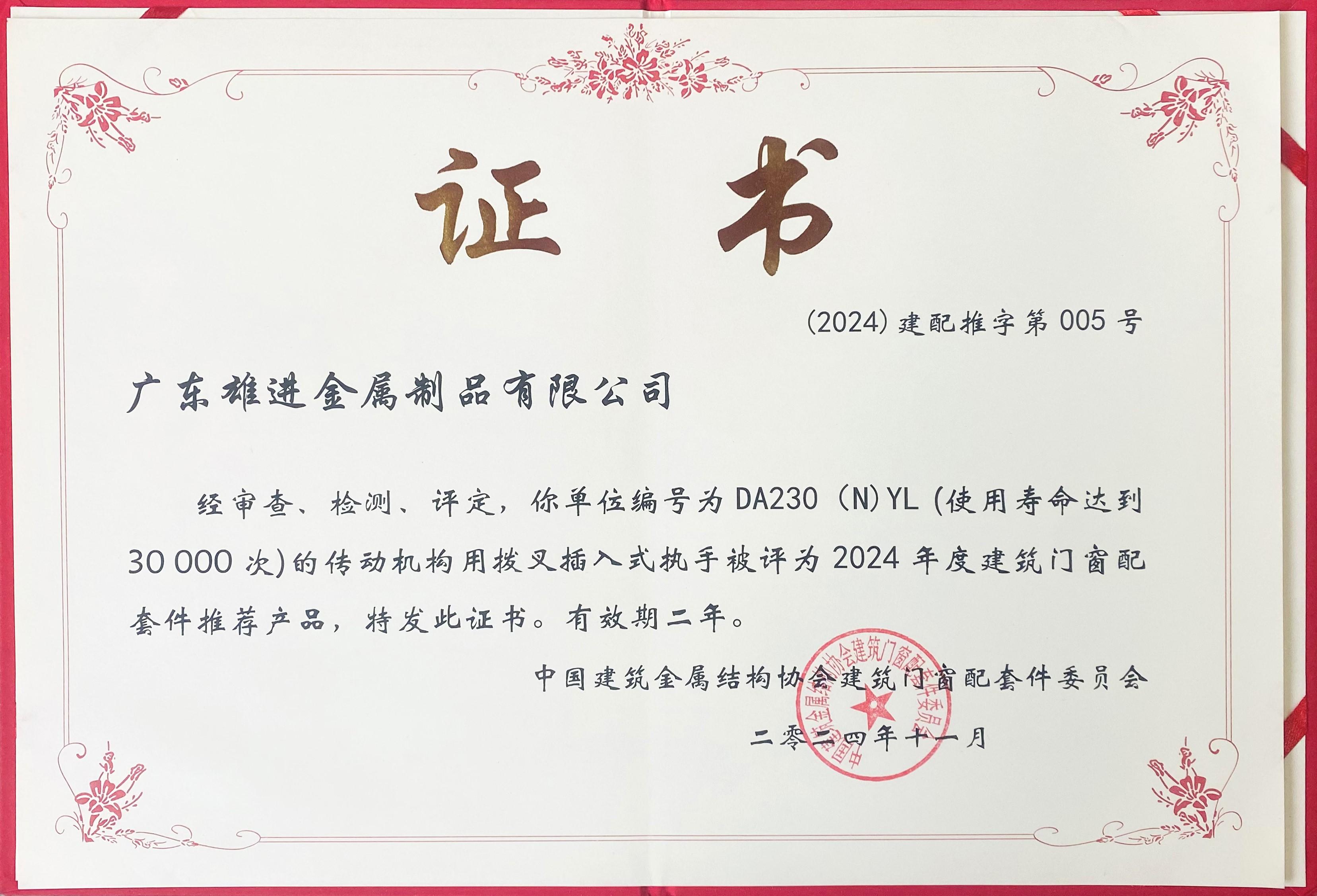 中国建筑金属结构协会建筑门窗配套件推荐产品DA230(N)YL |